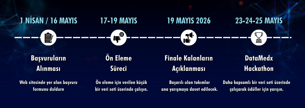 Daha önce DataMedX Hackathon’da ödül kazanmış katılımcılar bu yılki değerlendirme sürecine dahil edilmeyecek olup ilk kez başvuru yapan katılımcılara öncelik tanınacaktır.